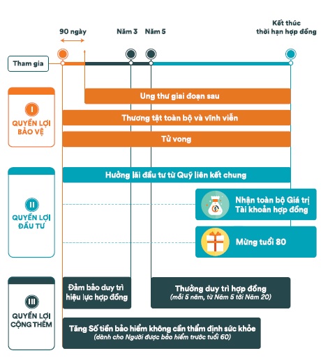Sản phẩm mang đến 3 quyền lợi bảo vệ cho người được bảo hiểm : quyền lợi bảo vệ, đầu tư và quyền lợi cộng thêm.